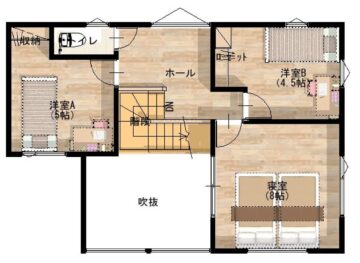 | 1階床面積 | 64.58㎡ | 2階床面積 | 44.16㎡ | 延床面積 | 108.74㎡ |