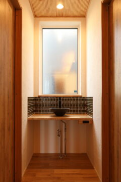 ・帰宅してすぐに手が洗える『ただいま手洗い』信楽焼のボウルと模様貼りのモザイクタイルがアクセントに