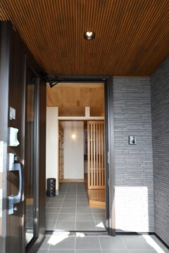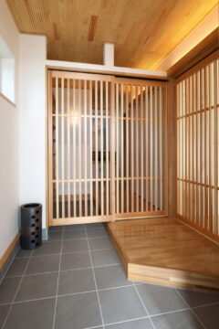 ・玄関とポーチ天井には南部赤松をふんだんに使い、中に入ると杉材で造られた格子戸もあり、木の風合いを感じられます