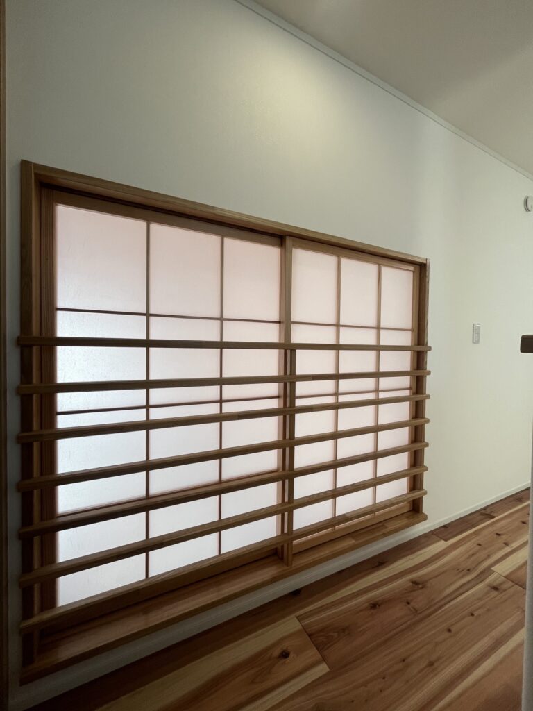 この障子は開け閉めができ、光を取り込みながら、自然と一階と二階の気配がつながる設計です。