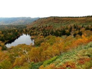 眼下に青い沼と、それを囲む紅葉の錦の木々が織りなす風景に心を奪われました。