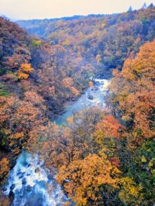 10月に訪れた際は、地熱発電所付近から紅葉の絨毯が始まり、