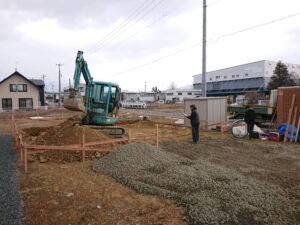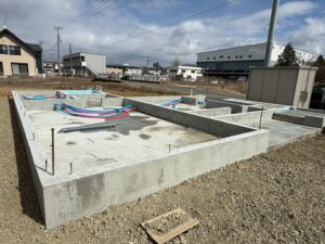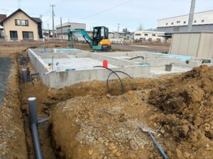 基礎工事、コンクリート打設も無事終わり現在現場では土台敷きを行っている最中です。