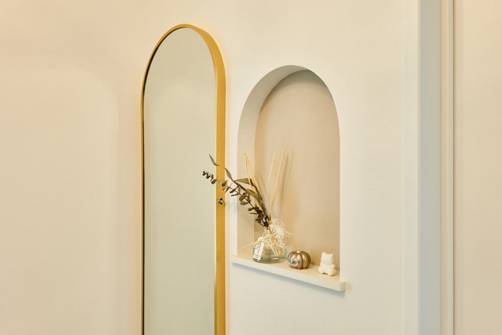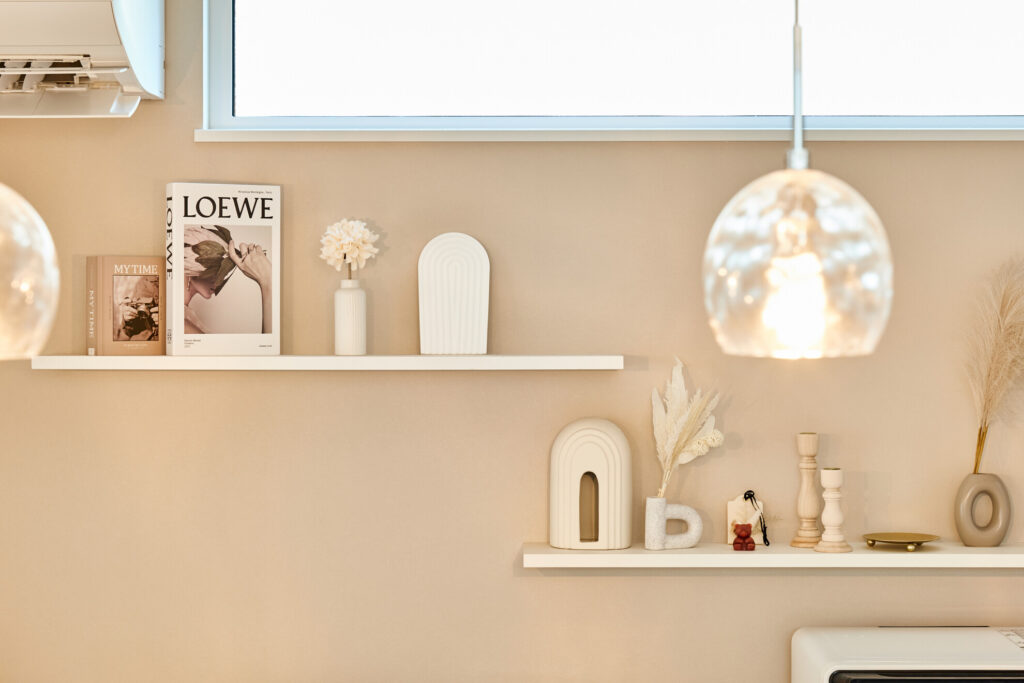 キッチンの前面収納だったり、階段の腰壁を海外風の手すりにしてもらったり、ダイニング後ろのデスクや飾り棚、小上がりの床下収納にニッチもたくさん造ってもらいました。