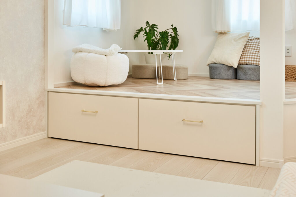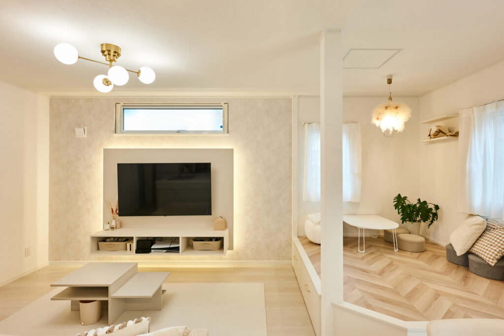 白を基調にベージュも使いたい、テレビ台のところはフロートにしたい、リビングの収納を増やしたい、リビング横に小上がりをつくりたい、などなど、決めたあとでもたくさん変更を依頼してしまいました。